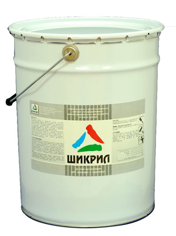Краска для шифера «Шикрил» обладает высокой укрывистостью и светостойкостью. Краска по шиферу устойчива к действию атмосферных факторов (снег, дождь, УФ-излучение). Кровельная краска высоко эластична, долго сохраняет внешний вид. Покраска шифера краской «Шикрил» предотвращает появление мха, водорослей и лишайника.