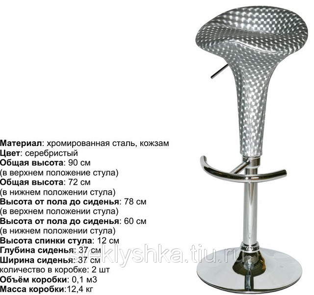 Стулья барные хром. Сиденье барного стула обтянуто искусственной кожей. Ножка изготовлена из хромированной стальной трубы, внутри которой расположен механизм газ-лифт. Страна производитель Россия. Доставка в любой регион. Оптовикам хорошие скидки. Цена: 3 450 руб. http://mebelbestoption.ru/katalog/c55-Stulya_barnie.html