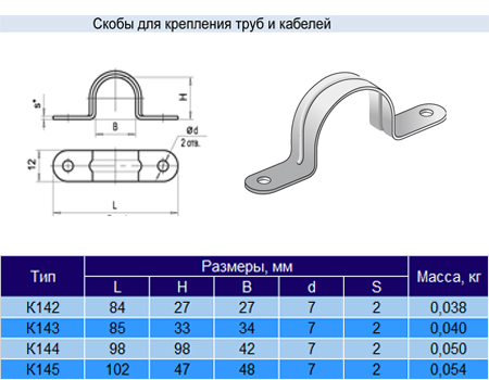 • Скоба К145 двухлапковая служит для крепления труб, кабельный кабелей и электрических проводов к строительным конструкциям с помощью винтов, шурупов ( К142, К143, К144, К145)