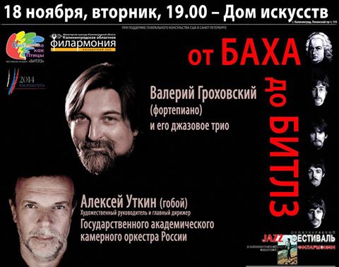 18 ноября, во вторник, в 19.00 в Доме искусств в рамках XI Международного фестиваля «Джаз в филармонии», при поддержке Генерального консульства США в Санкт-Петербурге, Фестиваль музыки Битлз «Свободные как птицы» и Калининградская областная филармония им. Светланова (Россия, Калининград) представляют программу Валерия Гроховского (Россия, США) «От Баха до Битлз». В концерте принимают участие: Государственный академический камерный оркестр России, художественный руководитель, главный дирижер и солист (гобой) – Алексей Уткин, Джазовое трио Валерия Гроховского.