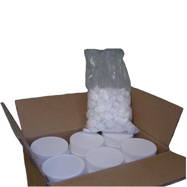 Данные хлорные таблетки расфасованы в пластиковые банки с завинчивающейся крышкой.