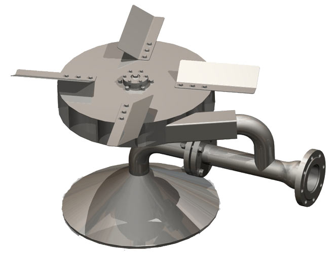 Описание: продукт от внешнего насоса подается в патрубок под давлением и делится на два потока. Первый поток попадает в горизонтальное сопло. Под действием направленной струи осадок срывается с днища резервуара. Второй поток попадает на лопатки горизонтального гидравлического блендера. Вращаясь, лопасти гидравлического блендера приводят в движение продукт, находящийся в резервуаре, одновременно увлекая за собой осадок, при этом скорость движения продукта такова, что позволяет поддерживать осадок во взвешенном состоянии (Техническое и экономическое обоснование необходимости использования устройств для размыва донных отложений типа веерные сопла СВ-1200).