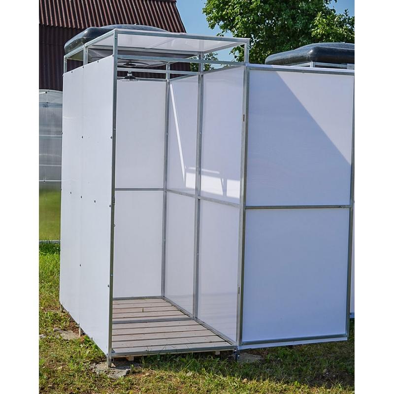 Прекрасное решение для дома и сада. Удобный, компактный, практичный в использовании .Предлагаем Вам душ отличного качества. Каркас из оцинкованной и грунтованной трубы 40*20 мм и 20*20 .В комплект входит : бак на 160 л ,насадка для душа ,поддон из обрезной доски (без покрытия),сотовый поликарбонат (толщина 4мм).Доставка по всей России бесплатно