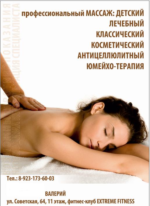 Владею следующими видами массажа: лечебный, сегментарный, точечный, вакуумный, антицеллюлитный (своя эффективная программа), тайский, массаж с элементами мануальной терапии, детский лечебный массаж с элементами лечебной гимнастики, медовый массаж, косметический массаж лица. 8923-173-60-03 Валерий. Буду рад вашему звонку!