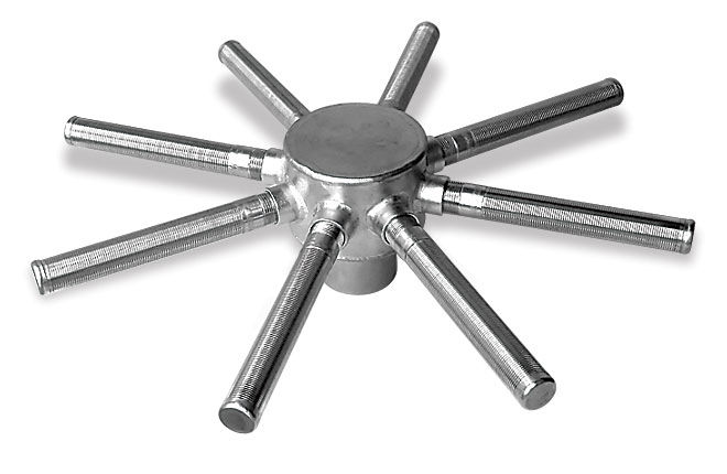 Верхнее распределительное устройство ВРУ обеспечивает важные гидравлические характеристики поступающего на фильтрацию потока и особенности операции по обратной промывке и регенерации фильтрующего материала. Предназначено для подвода в фильтр и равномерного распределения воды или регенерационного раствора, а также удаления промывочной воды или регенерационного раствора. Материал УВСР — сталь нержавеющая коррозионно-стойкая (нержавейка) 12Х18Н10Т.