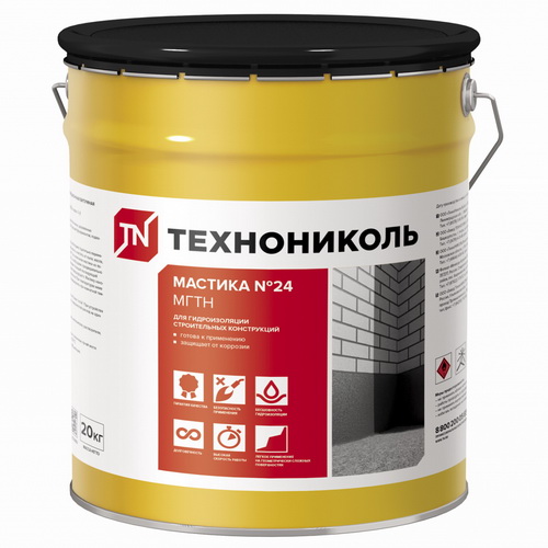 Мастика Технониколь №24 (МГТН) относиться к готовым к применению материалам на основе нефтяного битума. В состав также включены модифицирующие добавки, растворитель и минеральные наполнители. Используется битумная мастика для гидроизоляции. Подходит для железобетонных, бетонных, деревянных конструкций, обеспечивает их защиту при постоянном контакте с влажной средой и при заглублении в землю. Перед использованием материал обязательно перемешивают, а если нужно снизить вязкость, то используют растворители типа уайт-спирита. Наносится на сухую, чистую поверхность, предварительно обработанную битумным праймером. Время высыхания готового слоя до отлипа — менее суток. Полный набор гидроизоляционных свойств происходит за 7 суток в среднем. Точное время зависит от климатических условий (температуры и влажности), при которых этот процесс происходит. Стандартный расход гидроизоляционной битумной мастики — 1 кг/м2 для каждого слоя.